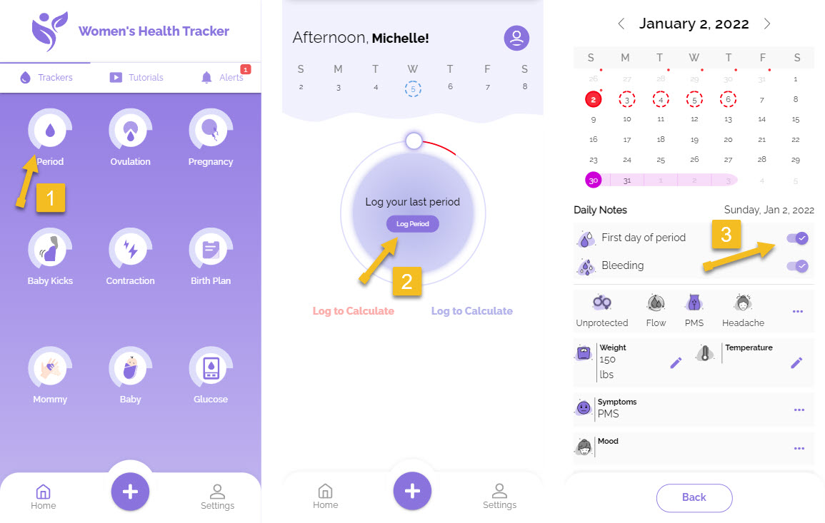 2) Whenever you get your period, log the first day of the period by selecting the date and then tapping on the "First day of period" toggle